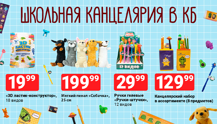 А вот и август — пора готовиться к школе! Но где купить красивые канцтовары, которые обязательно понравятся ребенку? Конечно в К&Б! Специально к 1 сентября мы привезли в магазины канцелярские наборы из 8 предметов (линейка, ластик, яркие наклейки, блокнот, гелевая ручка с игрушкой, 2 простых карандаша и подставка под канцелярию) с милыми хомячками-космонавтами и кактусами-ежиками. Вместе с ними в магазины приехали гелевые ручки с разноцветными забавными монстриками на колпачке, мягкие, плюшевые пеналы-собачки в ассортименте и ластики-конструкторы (дерзкий ананас, волшебный единорог, внимательный кенгуру и еще 15 крутых персонажей). С такими канцелярскими принадлежностями поход в школу будет вызывать положительные эмоции! Еще и на покупке классно сэкономите. Заходите в ближайший к вашему дому К&Б и закупайтесь к школе :)